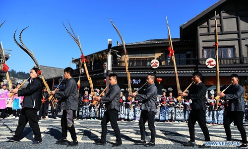 People of Miao ethnic group perform Lusheng, a folk musical instrument made of bamboo pipes, during a celebration of Jiyou Festival, a traditional folk festival, in Danzhai County of Qiandongnan Miao and Dong Autonomous Prefecture, southwest China's Guizhou Province, Dec. 7, 2019. (Xinhua/Yang Wenbin)