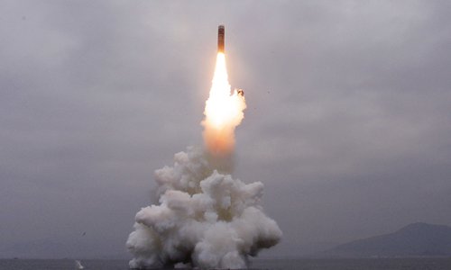 Photo provided by Korean Central News Agency (KCNA) on Oct. 3, 2019 shows the test-firing of the new-type ballistic missile, known as Pukguksong-3, in vertical mode in the waters off the Democratic People's Republic of Korea (DPRK)'s eastern Wonsan Bay. (KCNA/Handout via Xinhua)