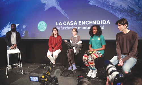 Sixteen-year-old climate activist Greta Thunberg (center) holds a press conference as she attends the 'March for Climate,' demanding action against climate change during the COP25 Climate Summit in Madrid, Spain on Friday. Photo: VCG