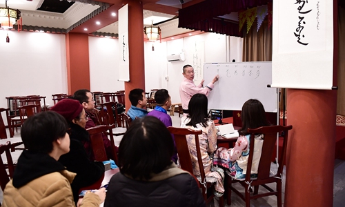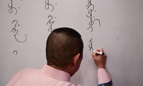 Fu Dawei (right), in the traditional Manchu costume, teaches Manchu language on Saturday. Photo: VCG