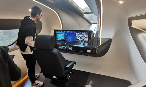 A man sits in the driver's cab of a prototype maglev train at the Zhejiang International Intelligent Transportation Industry Expo on Sunday. With a speed of 600 kilometers per hour, the train is an important breakthrough in maglev technology for China, media reports said. Photo: VCG
