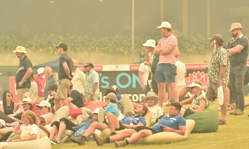 Spectators watch golf through thick haze from bushfires on Day 1 of the Australian Open golf tournament in Sydney on Thursday. Photo: VCG