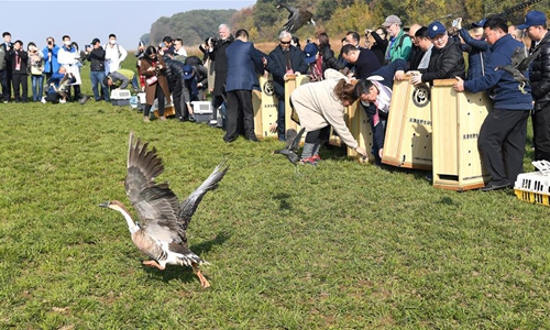 A swan goose (L) is released into the wild by staff members at the Jiangxi Poyang Lake National Nature Reserve in east China's Jiangxi Province, Dec. 8, 2019. A total of 120 cured migrant birds were released into the wild in Jiangxi on Sunday. (Xinhua/Wan Xiang)