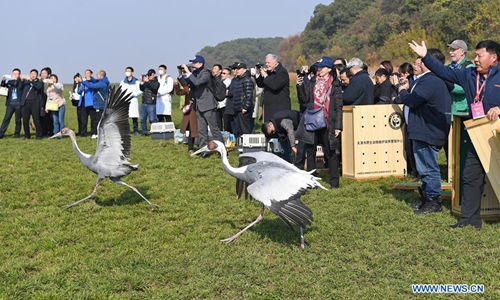 Two white-naped cranes are released into the wild by staff members at the Jiangxi Poyang Lake National Nature Reserve in east China's Jiangxi Province, Dec. 8, 2019. A total of 120 cured migrant birds were released into the wild in Jiangxi on Sunday. (Xinhua/Wan Xiang)