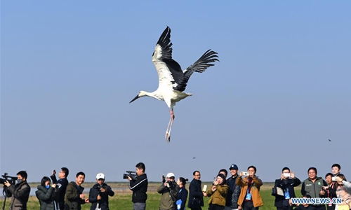 A white stork is released into the wild by staff members at the Jiangxi Poyang Lake National Nature Reserve in east China's Jiangxi Province, Dec. 8, 2019. A total of 120 cured migrant birds were released into the wild in Jiangxi on Sunday. (Xinhua/Wan Xiang)
