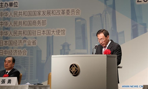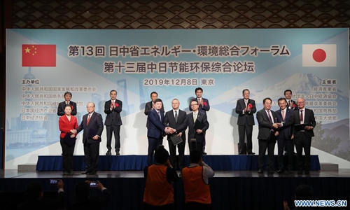 Deputy Director of the National Development and Reform Commission Zhang Yong (R) delivers a speech at the 13th China-Japan Comprehensive Forum on Energy Saving and Environmental Protection in Tokyo, Japan, Dec. 8, 2019. Officials, entrepreneurs, experts and scholars from China and Japan discussed cooperation and inked agreements on 26 cooperation projects at the 13th China-Japan Comprehensive Forum on Energy Saving and Environmental Protection here on Sunday. (Xinhua/Du Xiaoyi)