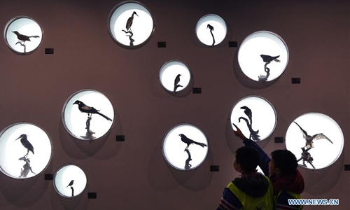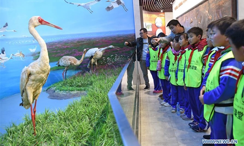 Students visit a publicity and education center themed on the protection of wetland and migrant birds at Poyang Lake, in Yongxiu County of Jiujiang City, east China's Jiangxi Province, Dec. 8, 2019. Covering an exhibition area of 1,314 square meters, the publicity and education center opened to public on Sunday. (Xinhua/Wan Xiang)
