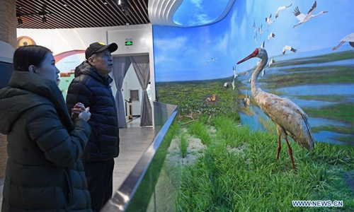 People visit a publicity and education center themed on the protection of wetland and migrant birds at Poyang Lake, in Yongxiu County of Jiujiang City, east China's Jiangxi Province, Dec. 8, 2019. Covering an exhibition area of 1,314 square meters, the publicity and education center opened to public on Sunday. (Xinhua/Wan Xiang)