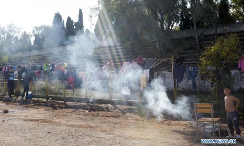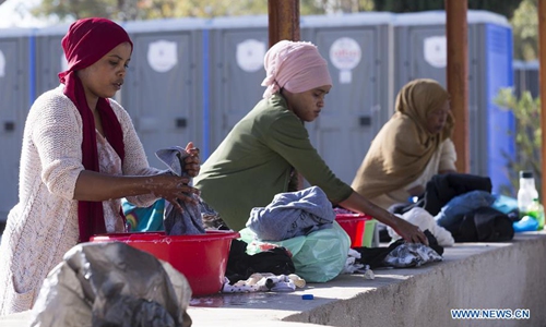 Women wash clothes at the Corinth refugee transit camp in Corinth, Greece, on Dec. 8, 2019. Some 90,000 refugees and migrants currently stranded in Greece, including 34,700 on islands, according to the latest official data from Greek authorities. (Xinhua/Marios Lolos)