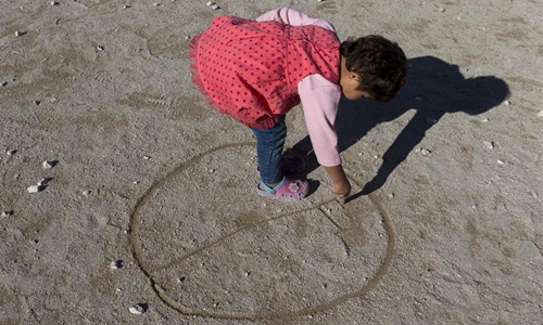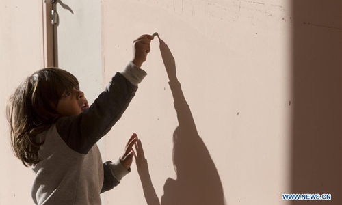 A child plays at the Corinth refugee transit camp in Corinth, Greece, on Dec. 8, 2019. Some 90,000 refugees and migrants currently stranded in Greece, including 34,700 on islands, according to the latest official data from Greek authorities. (Xinhua/Marios Lolos)