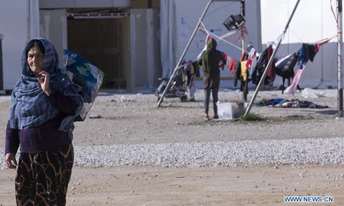 A woman is seen at the Corinth refugee transit camp in Corinth, Greece, on Dec. 8, 2019. Some 90,000 refugees and migrants currently stranded in Greece, including 34,700 on islands, according to the latest official data from Greek authorities. (Xinhua/Marios Lolos)