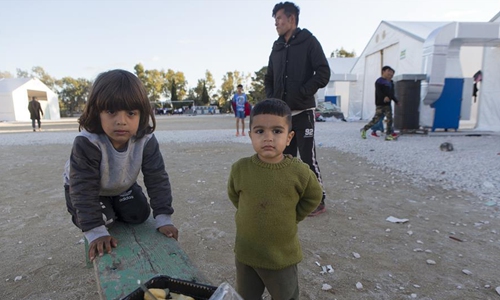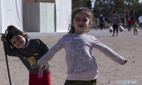 Children are seen at the Corinth refugee transit camp in Corinth, Greece, on Dec. 8, 2019. Some 90,000 refugees and migrants currently stranded in Greece, including 34,700 on islands, according to the latest official data from Greek authorities. (Xinhua/Marios Lolos)