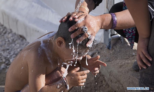 A boy takes a shower at the Corinth refugee transit camp in Corinth, Greece, on Dec. 8, 2019. Some 90,000 refugees and migrants currently stranded in Greece, including 34,700 on islands, according to the latest official data from Greek authorities. (Xinhua/Marios Lolos)