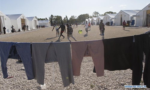 Children play at the Corinth refugee transit camp in Corinth, Greece, on Dec. 8, 2019. Some 90,000 refugees and migrants currently stranded in Greece, including 34,700 on islands, according to the latest official data from Greek authorities. (Xinhua/Marios Lolos)