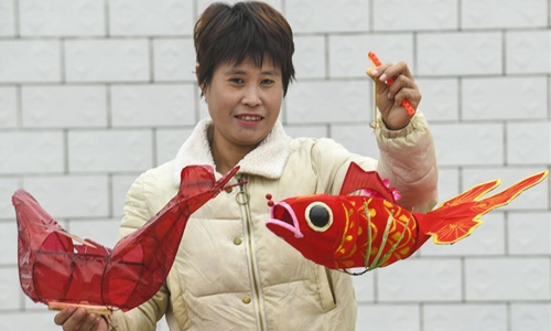 A villager makes a cartoon lantern at Jianguzhuang Village of Houyi Township in Yongqing County, north China's Hebei Province, on Dec. 8, 2019. As the Chinese New Year is drawing near, villagers of Houyi Township, renowned for lantern making, are busy making lanterns to supply the markets. (Xinhua/Li Xiaoguo)