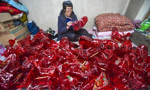 A villager makes lanterns at Jianguzhuang Village of Houyi Township in Yongqing County, north China's Hebei Province, on Dec. 8, 2019. As the Chinese New Year is drawing near, villagers of Houyi Township, renowned for lantern making, are busy making lanterns to supply the markets. (Xinhua/Li Xiaoguo)