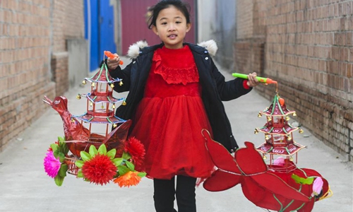 A girl shows lanterns made by her family at Jianguzhuang Village of Houyi Township in Yongqing County, north China's Hebei Province, on Dec. 8, 2019. As the Chinese New Year is drawing near, villagers of Houyi Township, renowned for lantern making, are busy making lanterns to supply the markets. (Xinhua/Li Xiaoguo)