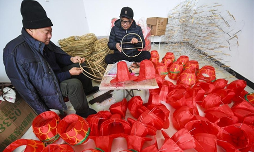 Villagers make lanterns at Jianguzhuang Village of Houyi Township in Yongqing County, north China's Hebei Province, on Dec. 8, 2019. As the Chinese New Year is drawing near, villagers of Houyi Township, renowned for lantern making, are busy making lanterns to supply the markets. (Xinhua/Li Xiaoguo)