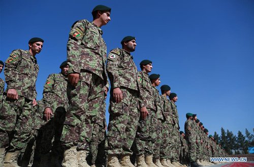 Afghan soldiers take part in a graduation ceremony at Kabul Military Training Center (KMTC) in Kabul, capital of Afghanistan, Sept. 16, 2019. A total of 1,154 newly graduated Afghan soldiers joined the country's national army on Monday, an army source said. (Photo: Xinhua)