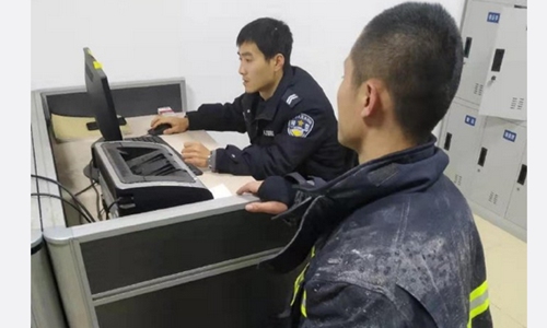 A firefighter (right) from Yangzhou, East China's Jiangsu Province, reports to local police that his phone had been stolen from a firetruck while he was risking his life putting out a blaze on Sunday. Screenshot from Sina Weibo.