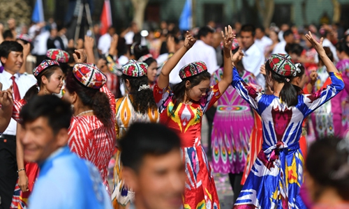 Residents in Urumqi, regional capital city of Northwest China's Xinjiang Uyghur Autonomous Region celebrate the 70th anniversary of the founding of the People's Republic of China on October 3. Photo: VCG