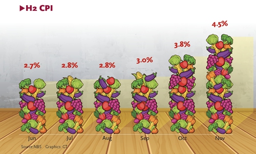 China's consumer price index (CPI), a main gauge of inflation, rose 4.5 percent year-on-year in November, beating market expectations of 4.2 percent, according to data released by the National Bureau of Statistics.