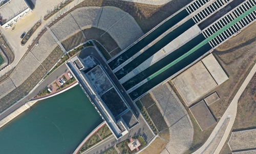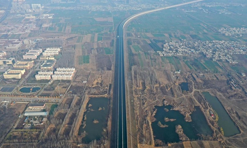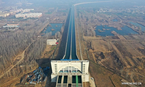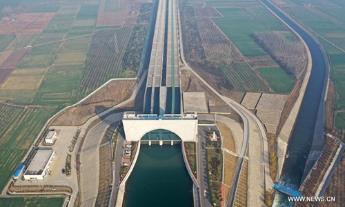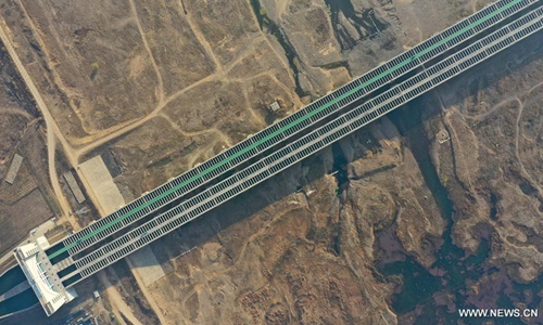 Aerial photo taken on Dec. 9, 2019 shows the Shahe aqueduct of the middle route of China's south-to-north water diversion project in central China's Henan Province. (Xinhua/Feng Dapeng)