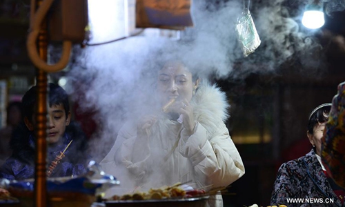 Tourists taste local snacks at the ancient city of Kashgar, northwest China's Xinjiang Uygur Autonomous Region, Dec. 8, 2019. The ancient city of Kashgar, with its well preserved traditional features, attracts tourists from all over the world. According to the official data, the ancient city has received nearly 1.35 million visits by Dec. 1 this year, an over 60% jump compared to the same period last year. (Photo by Adiljan Abdukadir/Xinhua)