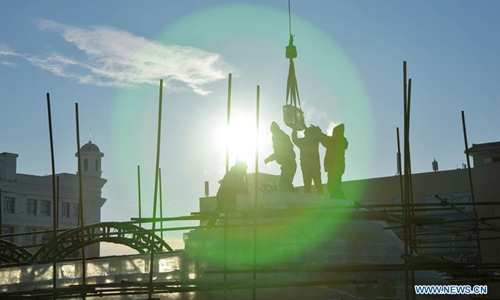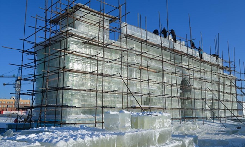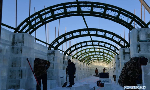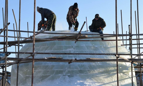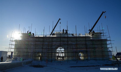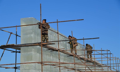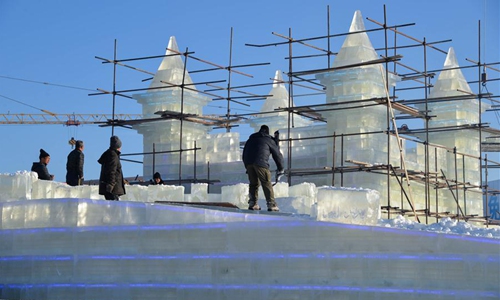 Workers make ice sculptures at the China-Russia border tourist area in Manzhouli, north China's Inner Mongolia Autonomous Region, Dec. 9, 2019, in preparation for the China-Russia-Mongolia ice snow festival and to welcome the new year. (Xinhua/Xu Qin)