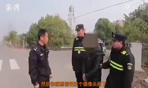 A truck driver from Nanjing, East China's Jiangsu Province is taken to the scene where he allegedly stole two surveillance cameras in the hope of covering up a traffic violation. Photo: Screenshot from video by thepaper.com