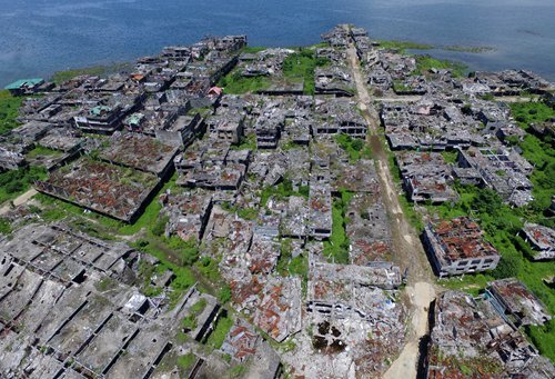 This aerial photo shows destroyed buildings in Marawi on the southern island of Mindanao on Thursday. Two years after Marawi was overrun by jihadists, it remains in ruins, with experts warning that stalled reconstruction efforts are bolstering the appeal of extremist groups in the volatile region. Photo: AFP