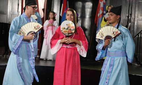 Students of the Confucius Institute of Banja Luka University dance in Chinese traditional costumes in Banja Luka, Bosnia and Herzegovina, on Sept. 22, 2018. The Confucius Institute of Banja Luka University organized a series of interactive workshops on the occasion of the Day of Confucius Institutes through a diverse program of activities in promoting Chinese culture on Saturday. Photo: Xinhua