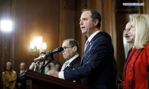 U.S. House Intelligence Committee Chairman Adam Schiff (C, Front) speaks at a news conference to announce articles of impeachment against U.S. President Donald Trump on Capitol Hill in Washington D.C., the United States, on Dec. 10, 2019. U.S. House Democrats on Tuesday moved forward by announcing two articles of impeachment, accusing U.S. President Donald Trump of abuse of power and obstruction of Congress, culminating over two months of investigation by Democrat-led House committees into the president's dealings with Ukraine. (Photo by Ting Shen/Xinhua)