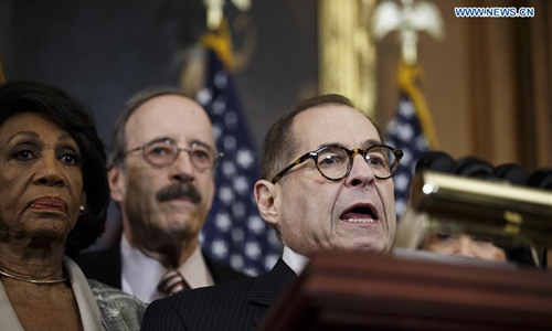 U.S. House Judiciary Committee Chairman Jerry Nadler (R, Front) speaks at a news conference to announce articles of impeachment against U.S. President Donald Trump on Capitol Hill in Washington D.C., the United States, on Dec. 10, 2019. U.S. House Democrats on Tuesday moved forward by announcing two articles of impeachment, accusing U.S. President Donald Trump of abuse of power and obstruction of Congress, culminating over two months of investigation by Democrat-led House committees into the president's dealings with Ukraine. (Photo by Ting Shen/Xinhua)