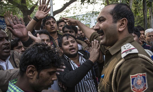 An Indian police officer pacifies relatives of fire victims as they shout against the government for delaying in handing over bodies to them outside a mortuary in New Delhi, India, Dec. 9, 2019. A fire broke out on Sunday inside a four storey building in north Delhi's "Filmistan" area, leaving at least 43 people dead. (Xinhua/Javed Dar)