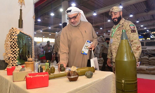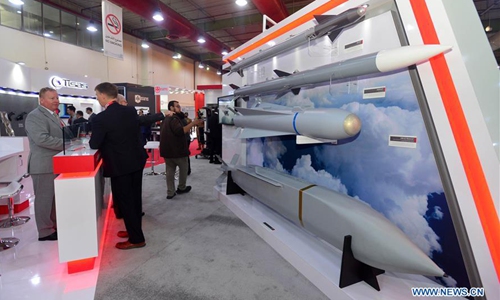 Visitors look at military equipment at the 5th Gulf Defense and Aerospace (GDA) exhibition in Hawalli Governorate, Kuwait, Dec. 10, 2019. The 5th GDA exhibition kicked off on Tuesday at the Kuwait International Fairground in Hawalli Governorate with the participation of more than 200 armament companies from 31 countries and regions. (Photo by Asad/Xinhua)