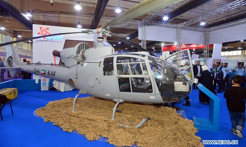 A helicopter is seen at the 5th Gulf Defense and Aerospace (GDA) exhibition in Hawalli Governorate, Kuwait, Dec. 10, 2019. The 5th GDA exhibition kicked off on Tuesday at the Kuwait International Fairground in Hawalli Governorate with the participation of more than 200 armament companies from 31 countries and regions. (Photo by Asad/Xinhua)