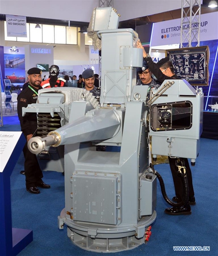 Visitors view military equipment at the 5th Gulf Defense and Aerospace (GDA) exhibition in Hawalli Governorate, Kuwait, Dec. 10, 2019. The 5th GDA exhibition kicked off on Tuesday at the Kuwait International Fairground in Hawalli Governorate with the participation of more than 200 armament companies from 31 countries and regions. (Photo by Asad/Xinhua)