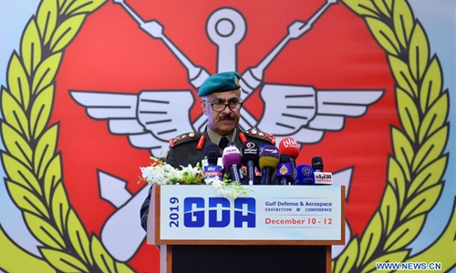 Mohammad Al-Khudhur, Kuwait's army chief of general staff, delivers a speech during the opening ceremony of the 5th Gulf Defense and Aerospace (GDA) exhibition in Hawalli Governorate, Kuwait, Dec. 10, 2019. The 5th GDA exhibition kicked off on Tuesday at the Kuwait International Fairground in Hawalli Governorate with the participation of more than 200 armament companies from 31 countries and regions. (Photo by Asad/Xinhua)