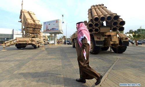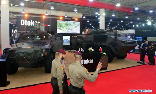A visitor passes by military equipment at the 5th Gulf Defense and Aerospace (GDA) exhibition in Hawalli Governorate, Kuwait, Dec. 10, 2019. The 5th GDA exhibition kicked off on Tuesday at the Kuwait International Fairground in Hawalli Governorate with the participation of more than 200 armament companies from 31 countries and regions. (Photo by Asad/Xinhua)