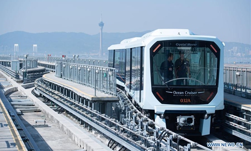 Photo taken on Dec. 10, 2019 shows a light rail train running in south China's Macao Special Administrative Region. The light rail in Macao opened to public on Tuesday. (Xinhua/Cheong Kam Ka)