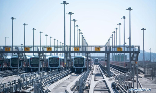 Photo taken on Dec. 10, 2019 shows light rail trains in south China's Macao Special Administrative Region. The light rail in Macao opened to public on Tuesday. (Xinhua/Cheong Kam Ka)