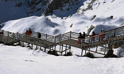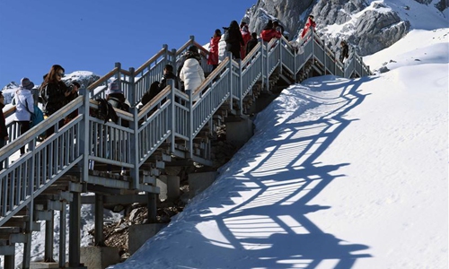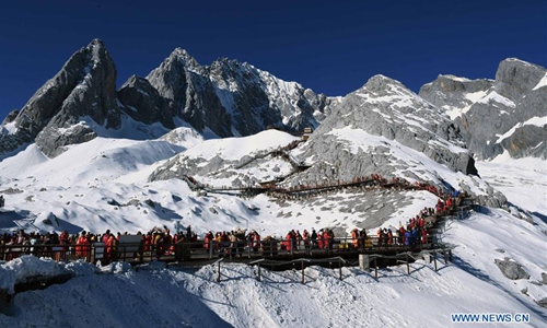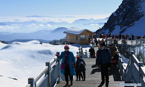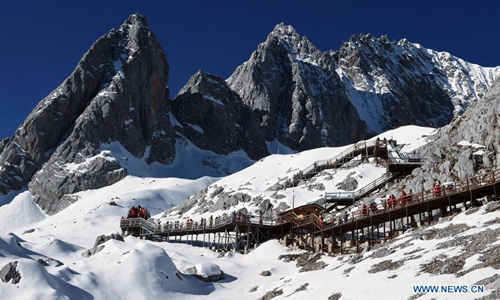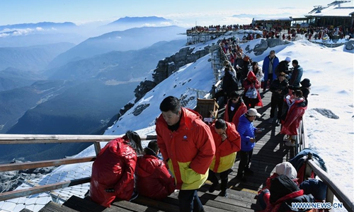 Tourists visit the Yulong Snow Mountain in Lijiang City, southwest China's Yunnan Province, Dec. 10, 2019. (Xinhua/Yang Zongyou)