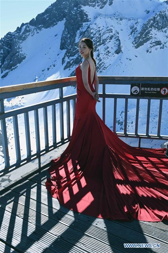 A tourist poses for photos at the Yulong Snow Mountain in Lijiang City, southwest China's Yunnan Province, Dec. 10, 2019. (Xinhua/Yang Zongyou)