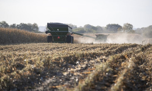Agricultural machinery works in a field of Grant Kimberley's family farm in Maxwell, the U.S. state of Iowa, Oct. 17, 2019. (Xinhua/Wang Ying)