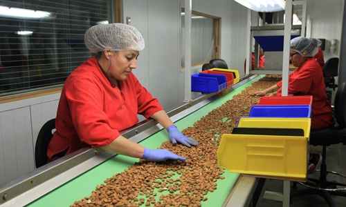 Workers process almond at a processing plant of Travaille and Phippen, an almond growing and processing enterprise, in Modesto, the United States, on April 25, 2018. (Xinhua/Gao Shan)