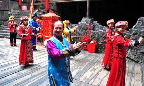 A reenactment of a Tu ethnic minority wedding in Yichang, Central China's Hubei Province is staged for an audinece that includes tourists from around the world. Photo: CNS