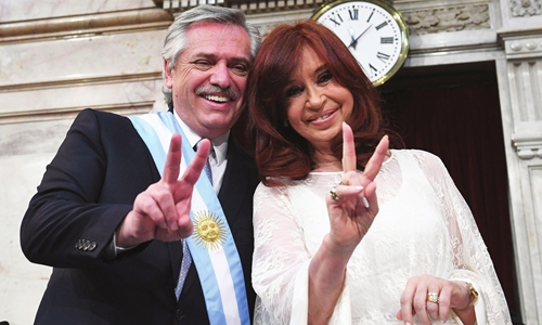 Argentina's new President Alberto Fernandez (left) and his Vice President Cristina Fernandez de Kirchner flash victory signs during his inauguration ceremony at the Congress in Buenos Aires on Tuesday. Photo: AFP