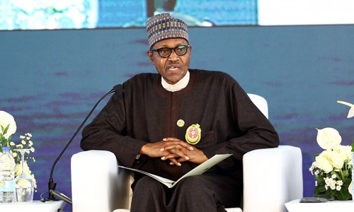 Nigerian President Muhammadu Buhari delivers a speech during the Aswan Forum for Sustainable Peace and Development in Aswan, Egypt, Dec. 11, 2019. (Xinhua/Ahmed Gomaa)