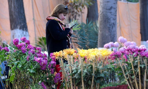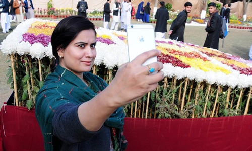 A woman takes a selfie as she visits a chrysanthemum flower show in northwest Pakistan's Peshawar on Dec. 11, 2019. (Photo by Saeed Ahmad/Xinhua)